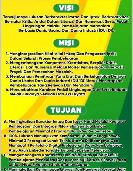 “Terwujudnya lulusan berkarakter imtaq dan iptek, berkreativitas, bernalar kritis, andal dalam literasi dan numerasi, serta peduli lingkungan melalui pembelajaran mendalam berbasis Dunia Usaha dan Dunia Industri (DU/DI).”.